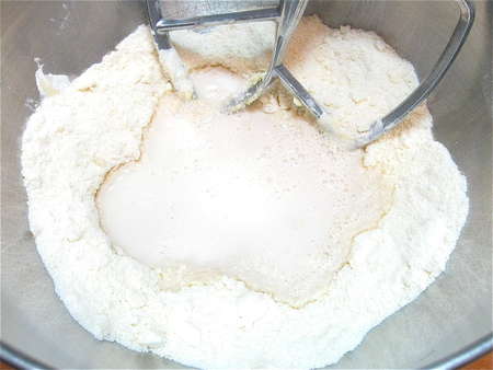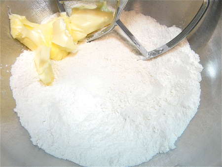 Add 6 tablespoons (85g) soft butter, and beat with an electric mixer at low speed, until the mixture looks sandy.