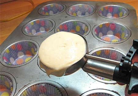 Scoop the batter by heaping 1/4-cupfuls into the prepared muffin tin. A muffin scoop works well here.
