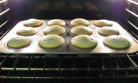 When they're done, they'll be domed, and a light golden brown around the edges. They'll spring back when pressed gently on top, and a toothpick inserted in the center will come out clean.