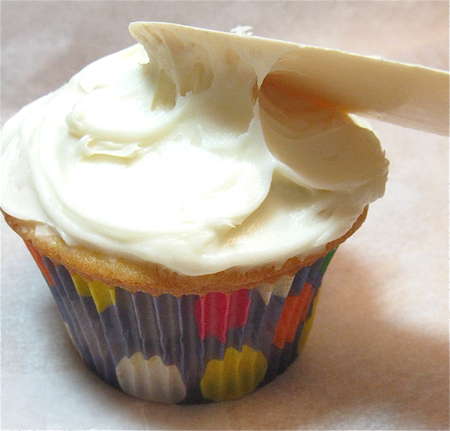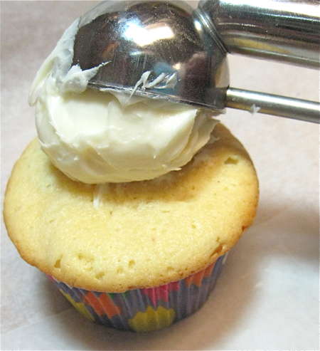 Dollop the icing onto a cupcake.