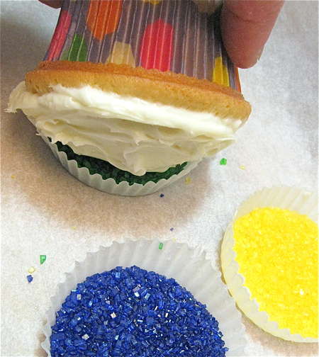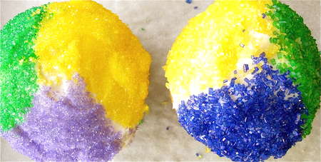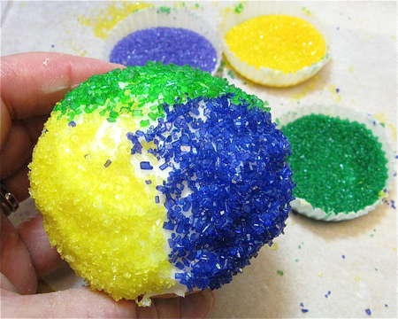 Place your three colored sugars – purple, yellow (gold), and green – into paper muffin cups. Dip 1/3 of the iced cake in one of the sugars.