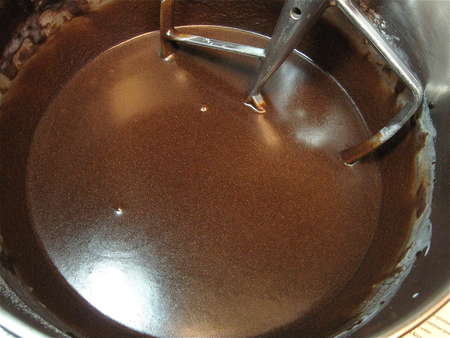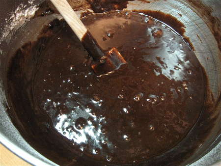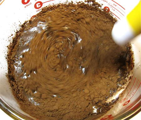 Melt 8 tablespoons (113g) butter, and stir in 1/4 cup (21g) Dutch-process cocoa powder, 1/2 teaspoon espresso powder, and 1/2 cup (113g) hot water.