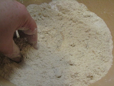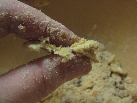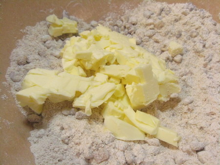 Working quickly to keep the butter cold, press the butter into thin "leaves". These leaves will keep your scones flaky and tender during baking. By coating the fat in flour, you'll have nice flakes of scone after the butter melts during baking.