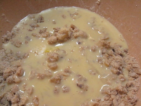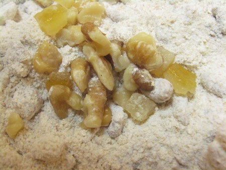 Add the toasted nuts and candied orange peel to the dry ingredients and toss well to coat. These scones are a bit wetter than other recipes and no kneading is done. Adding the nuts/peel now will save over-mixing later.