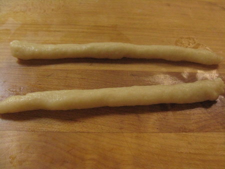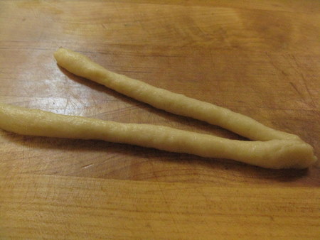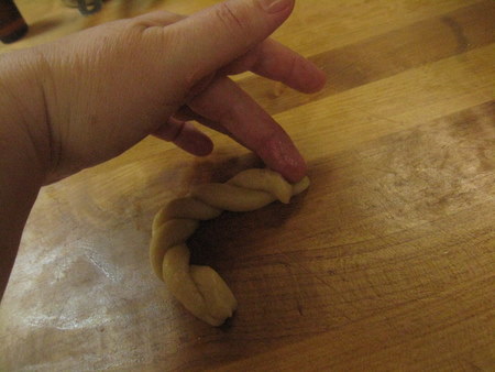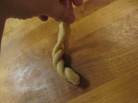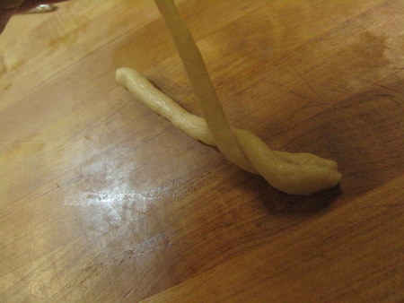 Pick up one strand and drape it across the other strand. Drape rather loosely so that the strands won't be too tight and burst during baking.