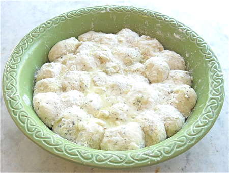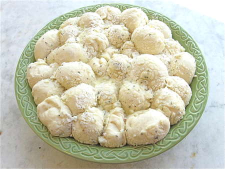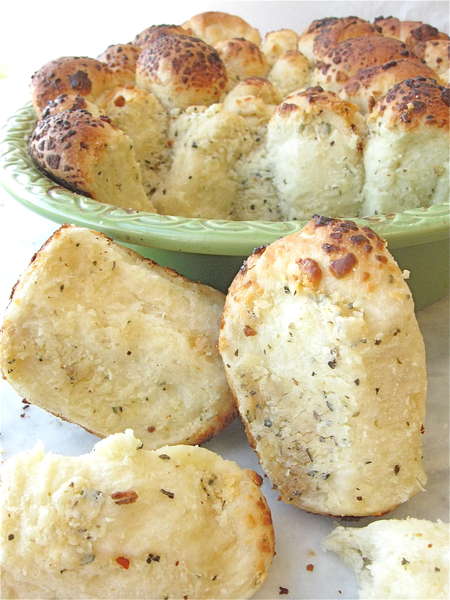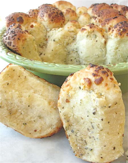 Next week I'll be posting the requisite green-colored treat (pistachio shortbread, to be exact), something you can bake and bring to the office as a visual salute to the holiday. But today, we're heading in a different direction: cheese, highlighted in a savory cheese- and herb-scented pull-apart bread.