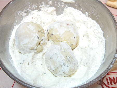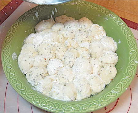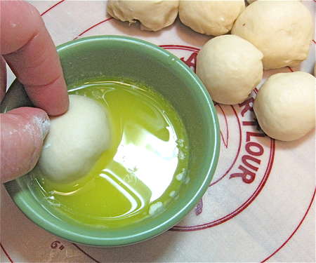 Let's start with a simple white bread dough. We'll cut it in pieces, coat each piece with butter, then roll in a blend of pizza seasoning and Vermont cheese powder.