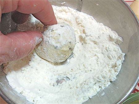 You can put several buttered balls of dough at a time into the coating, then shake the bowl to coat them with the cheese powder.