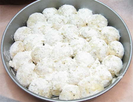 Put 4 tablespoons (57g) melted butter in a small bowl. Dip each ball in the butter...