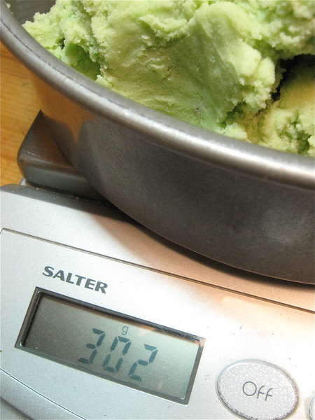 Divide the dough in half. A scale makes this easy. 604g of dough in the bowl...