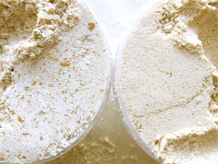 Traditional Irish-style wholemeal flour (left) is coarsely milled from red whole wheat. Golden wheat flour (right) is more finely ground, though it still retains a gently speckled appearance from the bran. I decided to try both types of flour in this recipe, to see the difference in the final product.