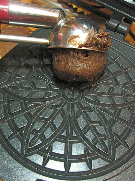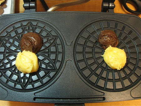 First, I dolloped equal-sized balls of batter – vanilla, and chocolate – on the iron.