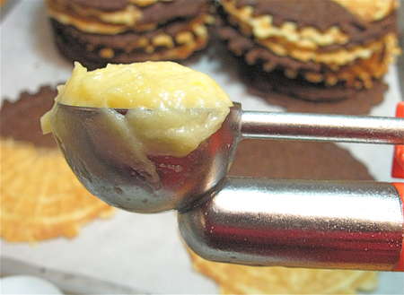 A teaspoon cookie scoop is a HUGE help here. Actually, two scoops are even better. Pictured above are a teaspoon scoop (left), and tablespoon scoop (right). The smaller scoop is perfect for half-and-half pizzelle; the larger, for single-flavor pizzelle.