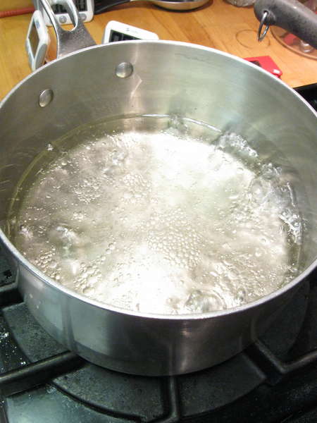 Next, boil 3 cups (680g) water, 1 cup (198g) oil (canola, to keep it safe), 1 to 1 1/4 teaspoons salt, and 2 tablespoons (25g) sugar. The liquid will look a bit thicker as it comes to a boil.