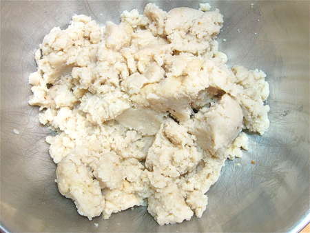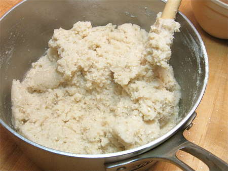 After boiling, add 2 cups (248g) matzo meal and 1 cup (145g) cake meal. The mixture will be quite stiff. I tried using a whisk at first, but quickly switched to a wooden spoon.
