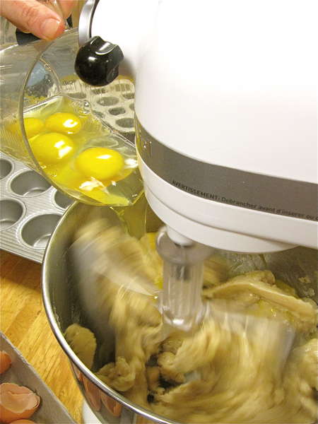 Add 12 large eggs, and beat. Since the mixture is so thick, a stand mixer is a big help here.