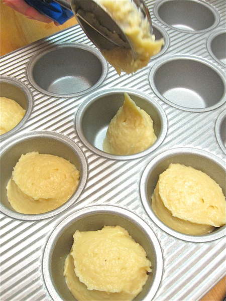 Scoop the stiff batter into the prepared pan, filling the cups about 3/4 full. For a standard muffin pan, our muffin scoop is perfect for the job. This is another one of those tools that once I tried using it, I had to go buy one in every size. Even though I don't consider myself a “baker,” I use them for everything. Cookies, cupcakes, muffins, ice cream, fillings, toppings...