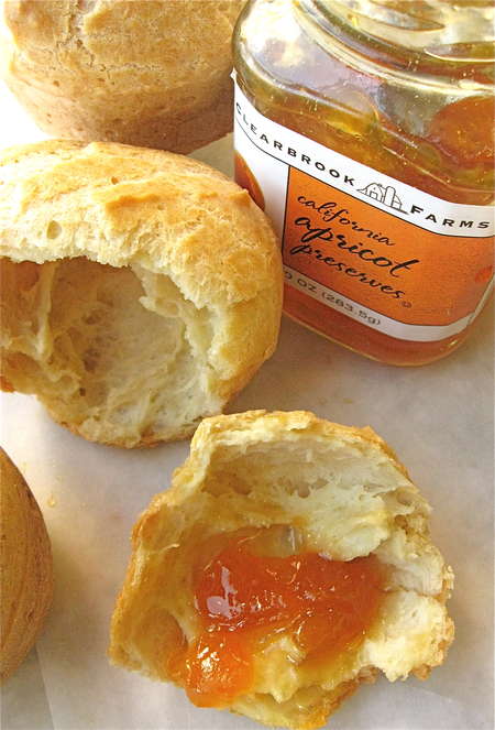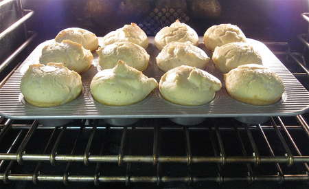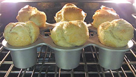 For fun, I also tried our standard popover pan and our mini-popover pan. The recipe will make 15 standard popovers; or 30 adorable little mini-popovers. For the standard popover pan, I baked a few minutes longer; for the minis, a few minutes less.