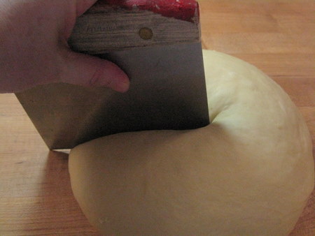 Now we're getting the hang of it, and you can see the braid beginning. Keep going down the whole bread, stopping just short of the bottom.