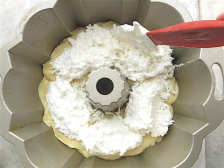 Oh, boy... isn't it a pleasure to work with a great Bundt pan! No sticks, no tears – that's one perfect-looking cake. Aside from the coconut filling you see peeking out around the inner edge... promise of good things to come.