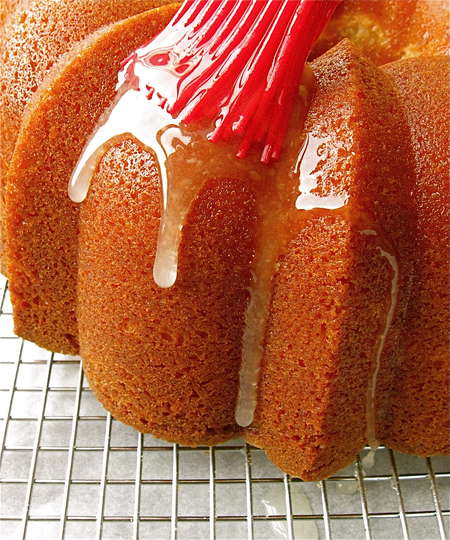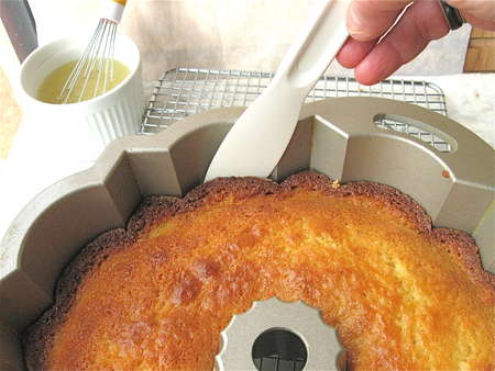 Once it's soaked in, brush some more on. The result is a mildly lemon cake with a moist, assertively lemon outer crust.