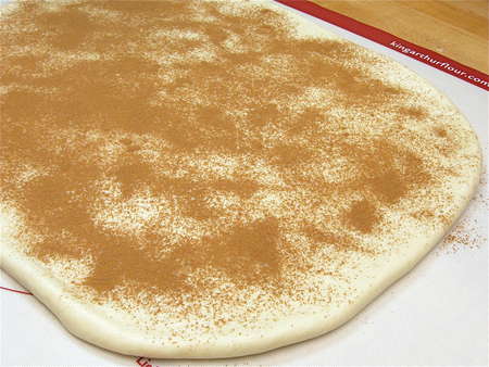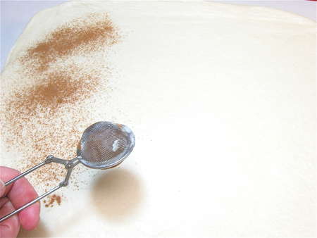 Sprinkle 2 teaspoons cinnamon over the surface of the dough. A small sieve or tea strainer works well here.