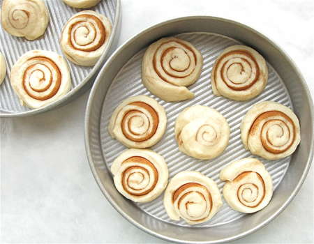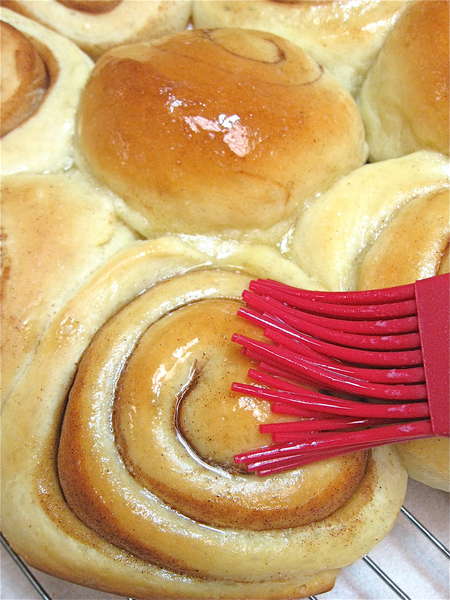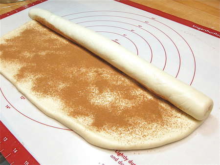 How come plain cinnamon, not cinnamon-sugar? Because sugar is hygroscopic, and will draw moisture from the dough. The result? Cinnamon buns that aren't as moist as they might be. Don't worry, the final sugar glaze on top will give you plenty of sweetness.