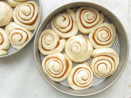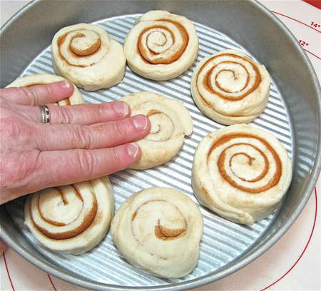 Lightly grease two 9” round cake pans. Divide the buns between the two pans, spacing 8 in each pan. Gently flatten the buns a bit.