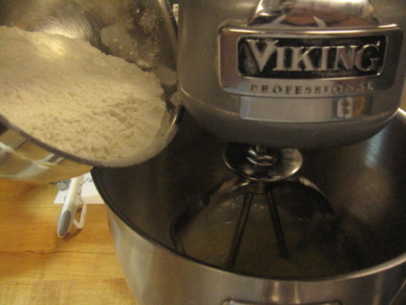 In a separate bowl combine the flour, baking powder and salt, and whisk well. Add to the liquids in the mixer and beat for 1 to 2 minutes. Don't forget to scrape the bowl down partway through the mixing.