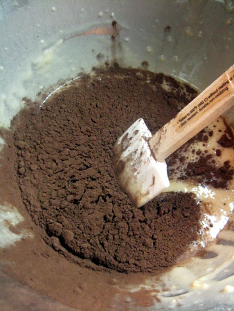 Sift the cocoa over the remaining batter in the bowl. It's important to sift rather than sprinkle to avoid lumps. (Go ahead, ask me how I know.) Remember, you're using baking powder in the recipe, so you should use Dutch-process cocoa. Powder and process both begin with a “P”, that's how I remember.