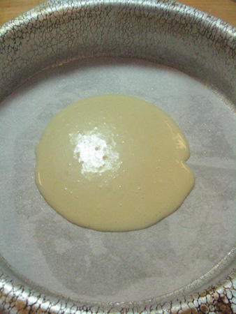 Place about 3 tablespoons of the vanilla batter into the center of your parchment-lined pan. The thin batter will begin to spread out. This is just what you're looking for.