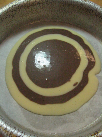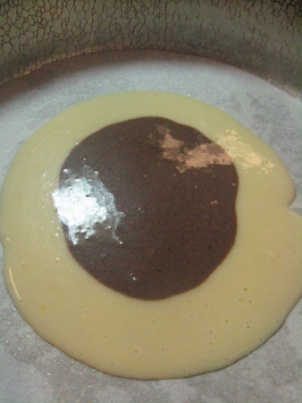 Next, pour about 3 tablespoons of the chocolate batter in the center of the vanilla batter, like a bulls-eye.