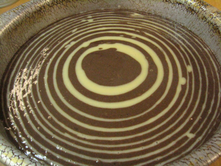 When both batters are finished you'll have a pan full of lovely rings. It doesn't look much like zebra stripes yet but just wait, the magic is coming.