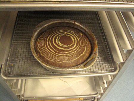 Bake the cake for 35-45 minutes, or until the vanilla stripes are golden brown and a cake tester inserted into the center of the cake comes out clean. Allow to cool for 5 to 8 minutes, then turn out onto a wire rack to cool completely. Peel off the parchment circle.