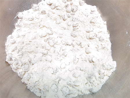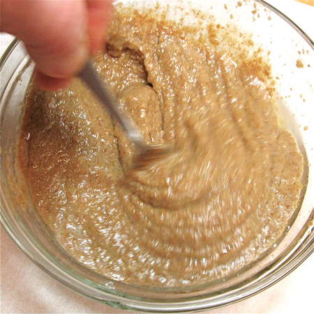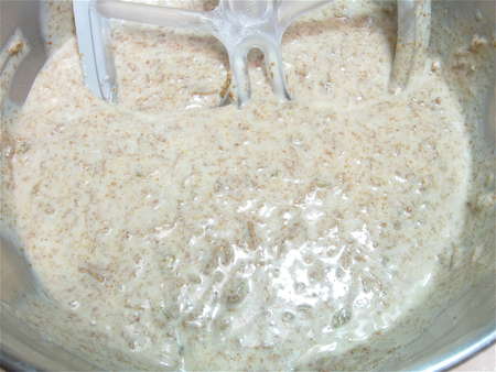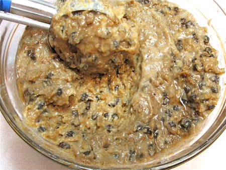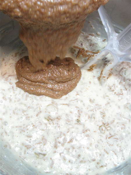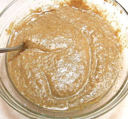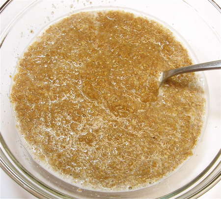 Next day, look how the bran cereal has absorbed the liquid. The batter has thickened considerably.