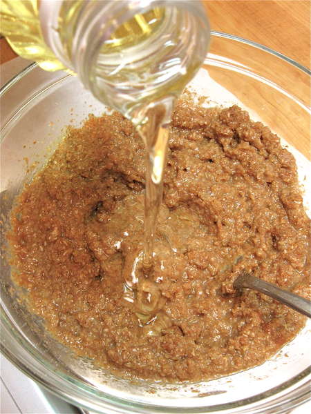 Add 1/2 cup (99g) vegetable oil to the cooled cereal.