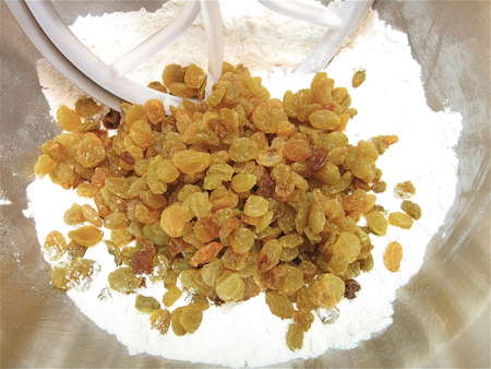 I first made this with golden raisins, then with currants. I prefer the currants, as they're smaller and distribute themselves throughout the batter more nicely.