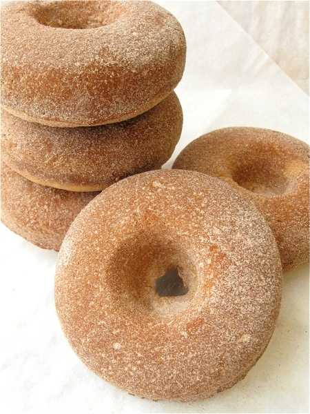 Spoon the batter into our lightly greased doughnut pan, filling the wells to about 1/4” shy of the rim; bake in a preheated 425°F oven for 10 minutes; remove from the oven, and shake warm doughnuts in a bag of cinnamon-sugar (no dipping in butter necessary). The recipe makes 12 to 14 doughnuts, depending on how full you fill the wells in the pan, so you'll have to bake in at least two batches (unless you have two pans).