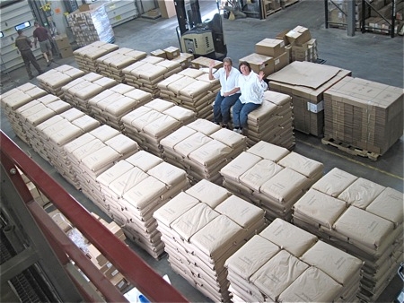 We use tons of flour (literally) blending our mixes here at our manufacturing facility in Vermont. Here are Martha and Barb, two of the members of our manufacturing team, with a newly arrived load of “the King.”