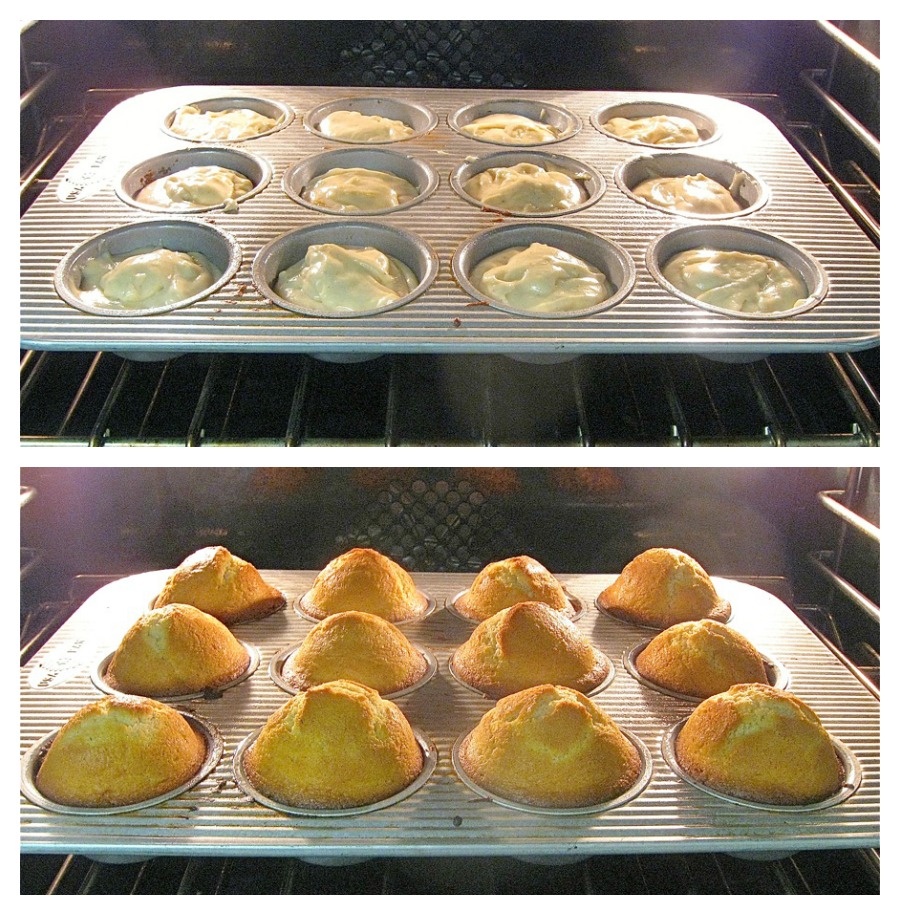 Bake the muffins for 15 to 17 minutes. They'll rise quite vigorously. The finished muffins are a pale golden brown and a cake tester inserted into the middle of one of the center muffins comes out clean.