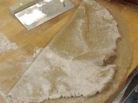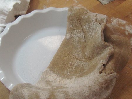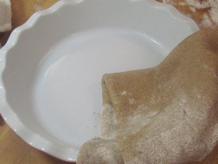 Roll the dough on a lightly floured surface to about 3/8” thick. To aid in moving the dough to the pie pan, first fold the circle in half,