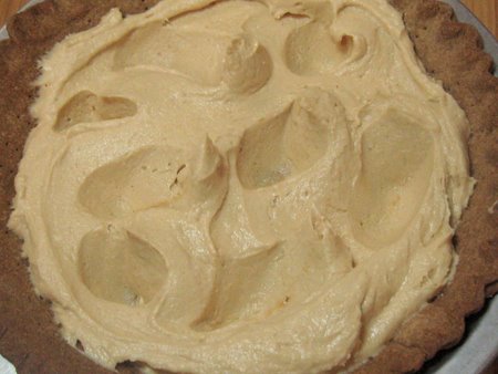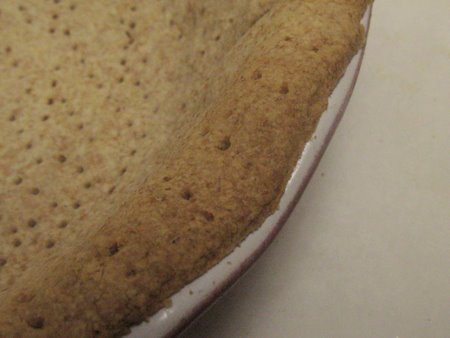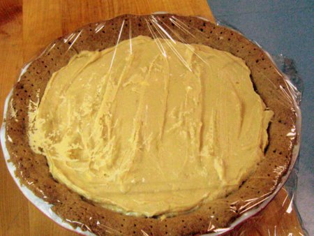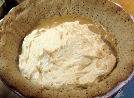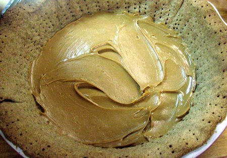 Spread half of the PBM filling into the pie shell; make some swirls and depressions with your spoon.