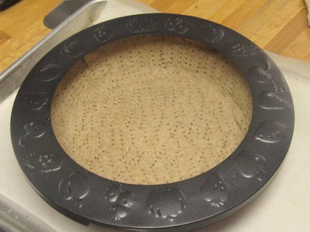Unfold the layers until the crust is open again. Gently fit it to the pan without pulling or stretching, as this would cause the crust to shrink later. Fix any tears with your fingers.