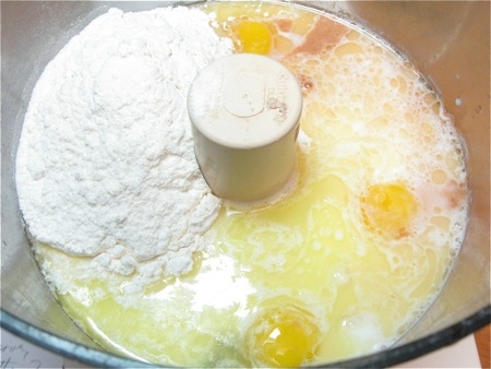 If you're using a mixer, beat the liquid ingredients, then add the sugar and flour, quickly whisking to combine.