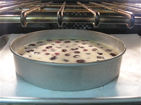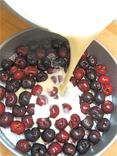 Pour the batter over the cherries in the pan.