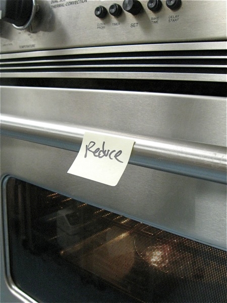 Reduce the oven heat to 350°F. I have a bad habit of forgetting to turn the oven down in situations like this...