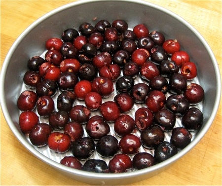 Put the cherries into the pan; they should form a single layer that pretty much covers the bottom.
