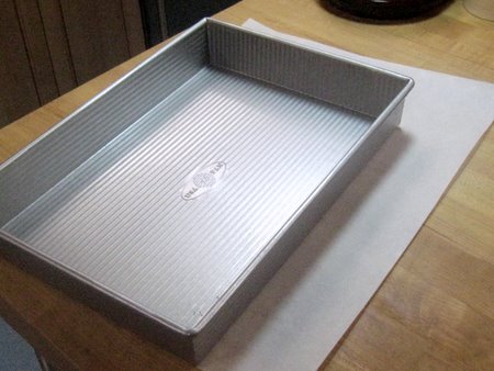 You'll need a parchment-lined sheet or pan to put the ice cream scoops on in the freezer. Our freezer here is quite full at the moment, so I opted for a 9” x 13” pan. Set it on the parchment and trace with a pencil to get the correct size to line the bottom of the pan. Cut with your trusty safety scissors.
