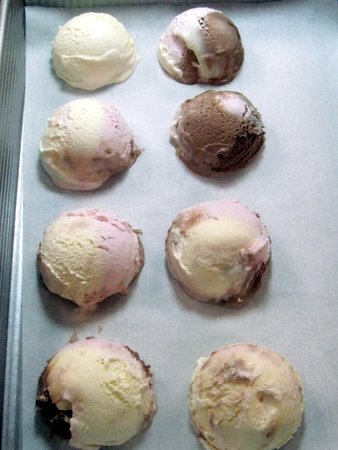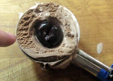 You can leave the scoops plain or for an extra special treat, you can fill them with another ice cream flavor or in this case, fresh plump cherries (pitted, please).