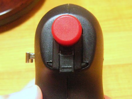 On the back face, you'll pull down the black switch under the red button with your thumb, locking it into place.